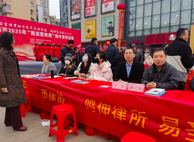 当日上午,律师余文扬、实习律师李政作为本所代表,参加了由中共黄石市委宣传部和黄石市司法局主办、黄石港区司法局协办的“宪法宣传周”集中宣传活动。在活动现场,余律师通过设立咨询台、发放宣传资料、现场讲解等方式,向广大市民普及宪法知识,解答法律疑问,引导群众树立宪法意识,增强法治观念。